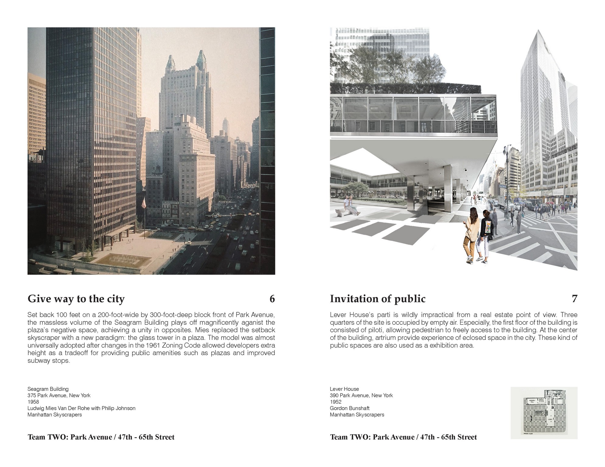 The studio started with research and analysis effort through a brief review of relevant discourse and an overview of both historic and contemporary conditions of the sites around Park Avenue. Following the initial overview, fact based investigations with focused research and analytic documentations instigated the individuated agendas of the design projects. In the design phase, students were asked to test and define project trajectories and potential strategies at specific zones along Park Avenue, articulating the rationales and impact at multiple scales, geographies, and time frames. The emphasis of the course was on the production of rigorously articulated architectural propositions that each engages the critical inquiry of the studio topic with a distinctive thesis.